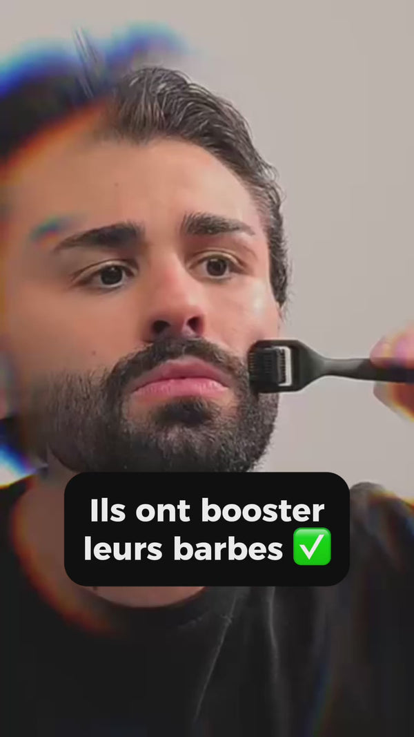 - Le Beard Roller : qui stimule la circulation sanguine, réveille les follicules dormants et prépare ta peau à mieux absorber les actifs.